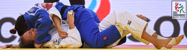 Double Olympic medallist and former world champion Audrey TCHEUMEO (FRA) was eliminated in round three by Aleksandra BABINTSEVA (RUS) in arguably the biggest shock of the opening session on day six. Former world champion Marhinde VERKERK (below - blue judogi) from the Netherkands then beat the Russian by ippon for a semi-final spot.