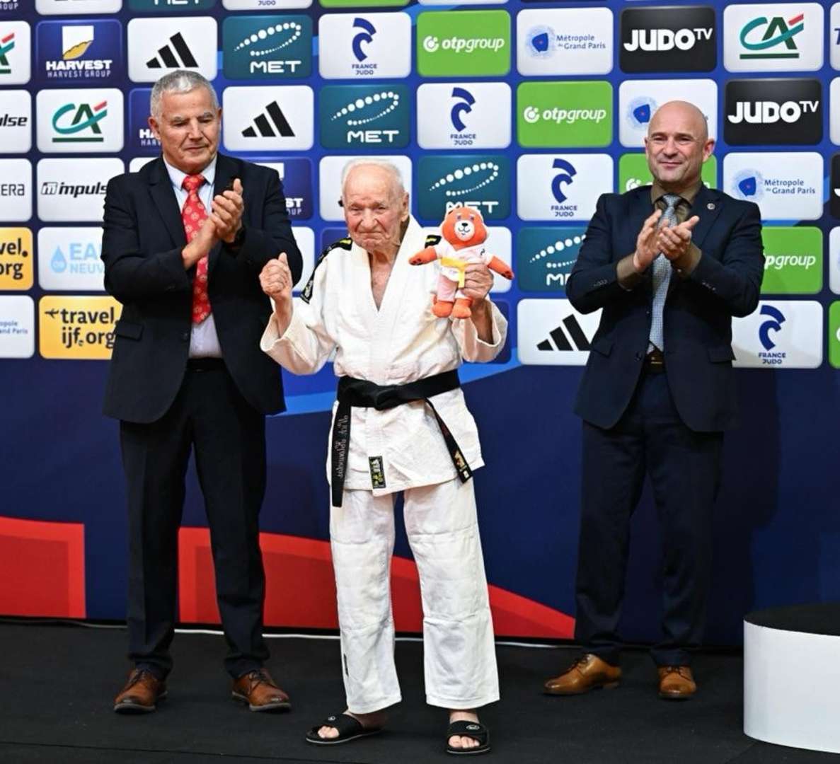To further highlight the extraordinary ability of veteran judo to unite generations, Nikolaos Klouvatos (Greece), a 7th Dan judoka at the remarkable age of 96, was honoured on the tatami just moments before the final block began. He was celebrated by Denis Weisser and Jean-Luc Bartoli, and received a resounding standing ovation from all spectators and participants — a moving tribute to a lifetime dedicated to the spirit and practice of judo.